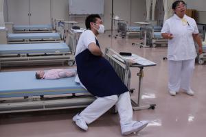 今回も白衣に着替えて、看護実習室にて演習です。